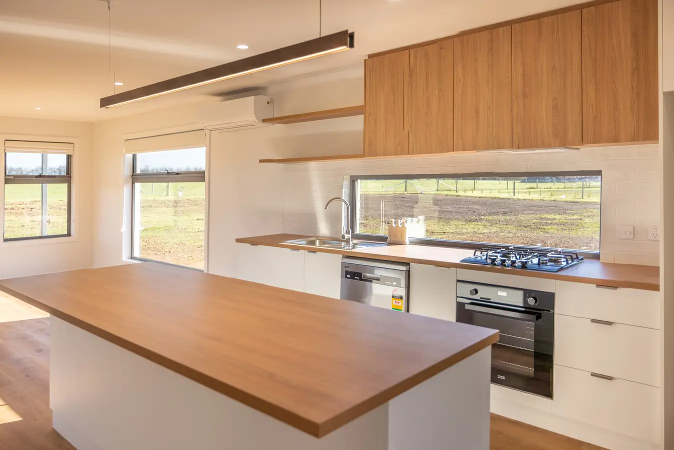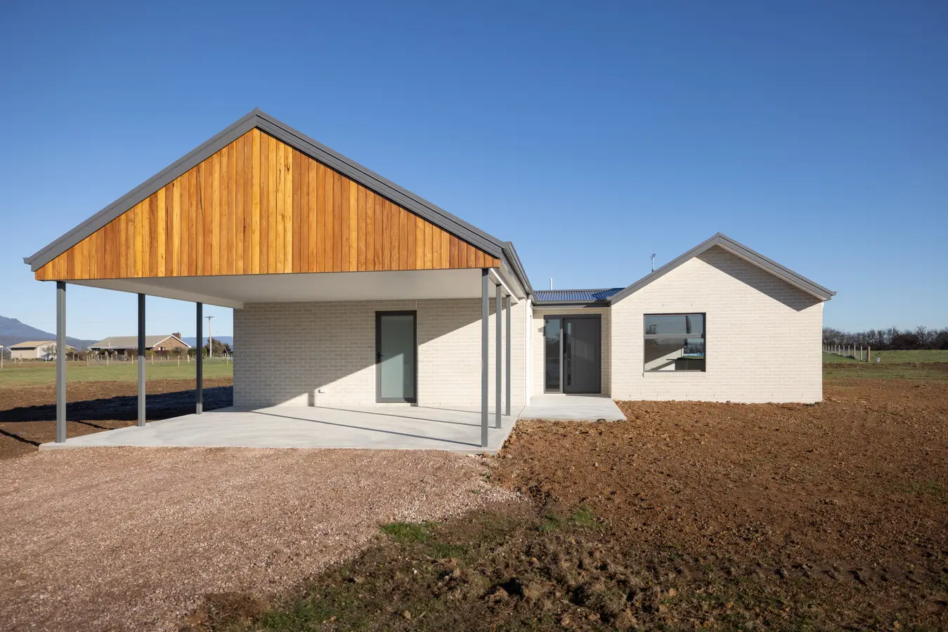This striking barn-inspired home pairs high gabled ceilings and bold black cladding with the warmth of natural timber tones and light-filled interiors. Designed to celebrate its surroundings, every element — from the spacious open-plan living area to the carefully framed country views — brings comfort and craftsmanship together in perfect balance.